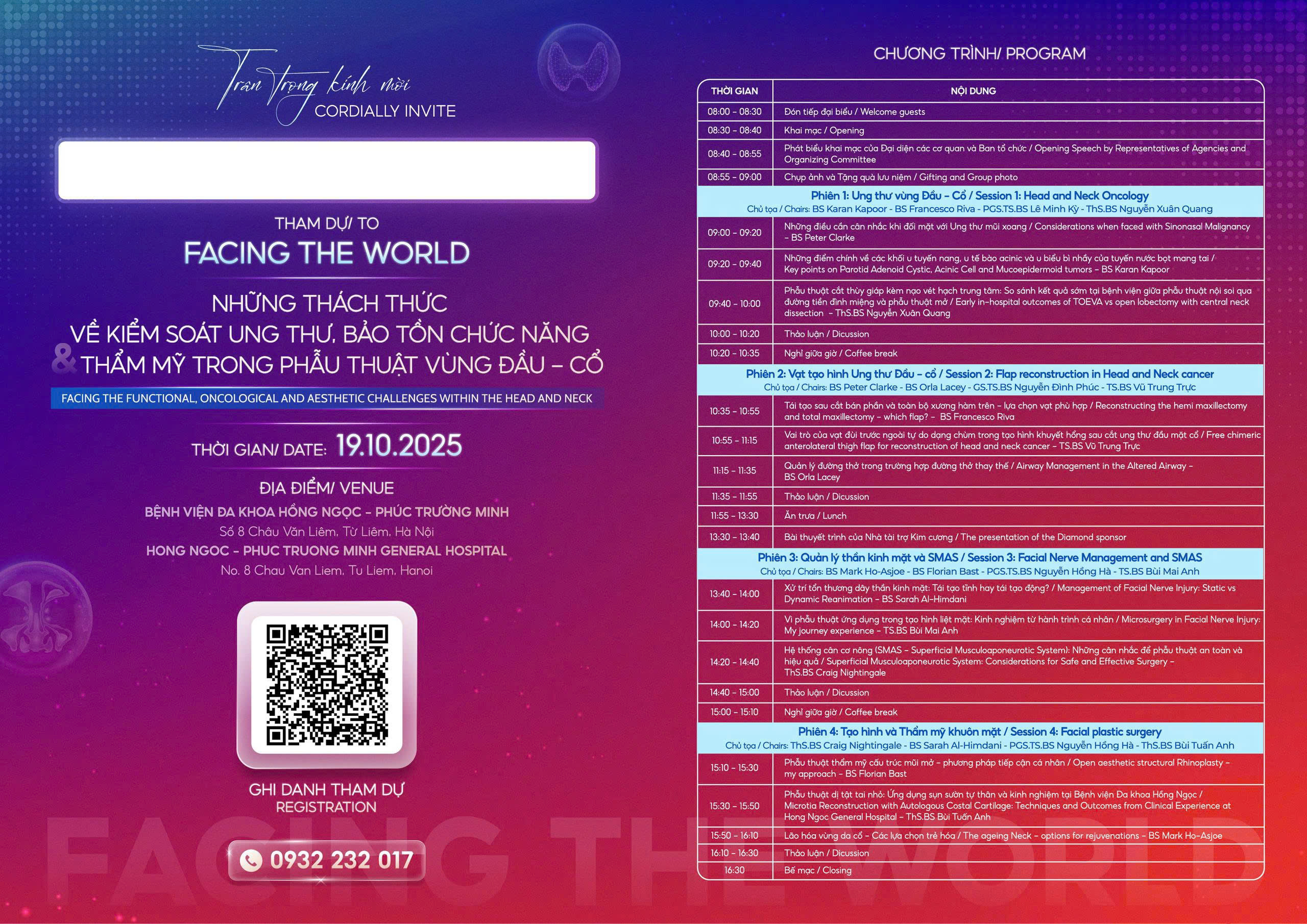Hội nghị do Facing The World phối hợp cùng Hội Tai Mũi Họng Hà Nội và BVĐK Hồng Ngọc - Phúc Trường Minh tổ chức, mục tiêu tìm ra lời giải cho những thách thức trong phẫu thuật ung thư vùng đầu - cổ: làm sao đảm bảo loại bỏ triệt để bệnh tích, đồng thời vẫn giữ gìn được chức năng quan trọng và đặc biệt là duy trì yếu tố thẩm mỹ để nâng cao chất lượng sống cho người bệnh.